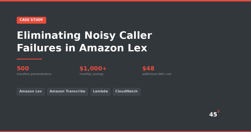 How we helped a client cut 500 unnecessary agent transfers per month by rearchitecting their Amazon Lex voice bot for noisy real-world environments.